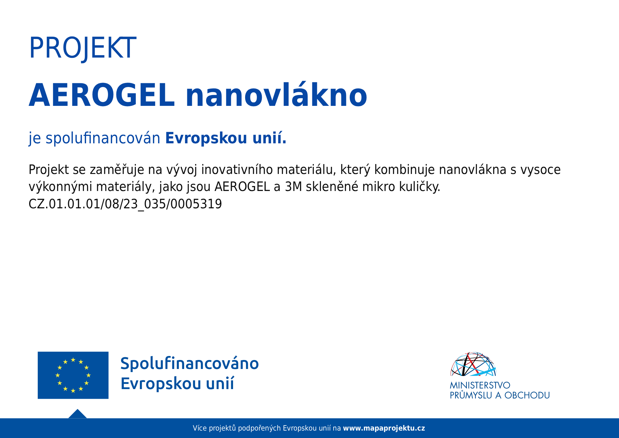 Projekt se zaměřuje na potenciál možnosti vývoje inovativního materiálu, který kombinuje nanovlákna s vysoce výkonnými materiály, jako jsou AEROGEL a 3M skleněné mikro kuličky (3M micro bubbles). Cílem projektu je ověřit proveditelnost tohoto konceptu a potvrdit možnost přípravy nanovlákenné struktury pomocí technik elektrického zvlákňování v kombinaci s těmito materiály, případně s jejich kombinací. Hlavním úkolem je zjistit technickou a technologickou proveditelnost této kombinace.
